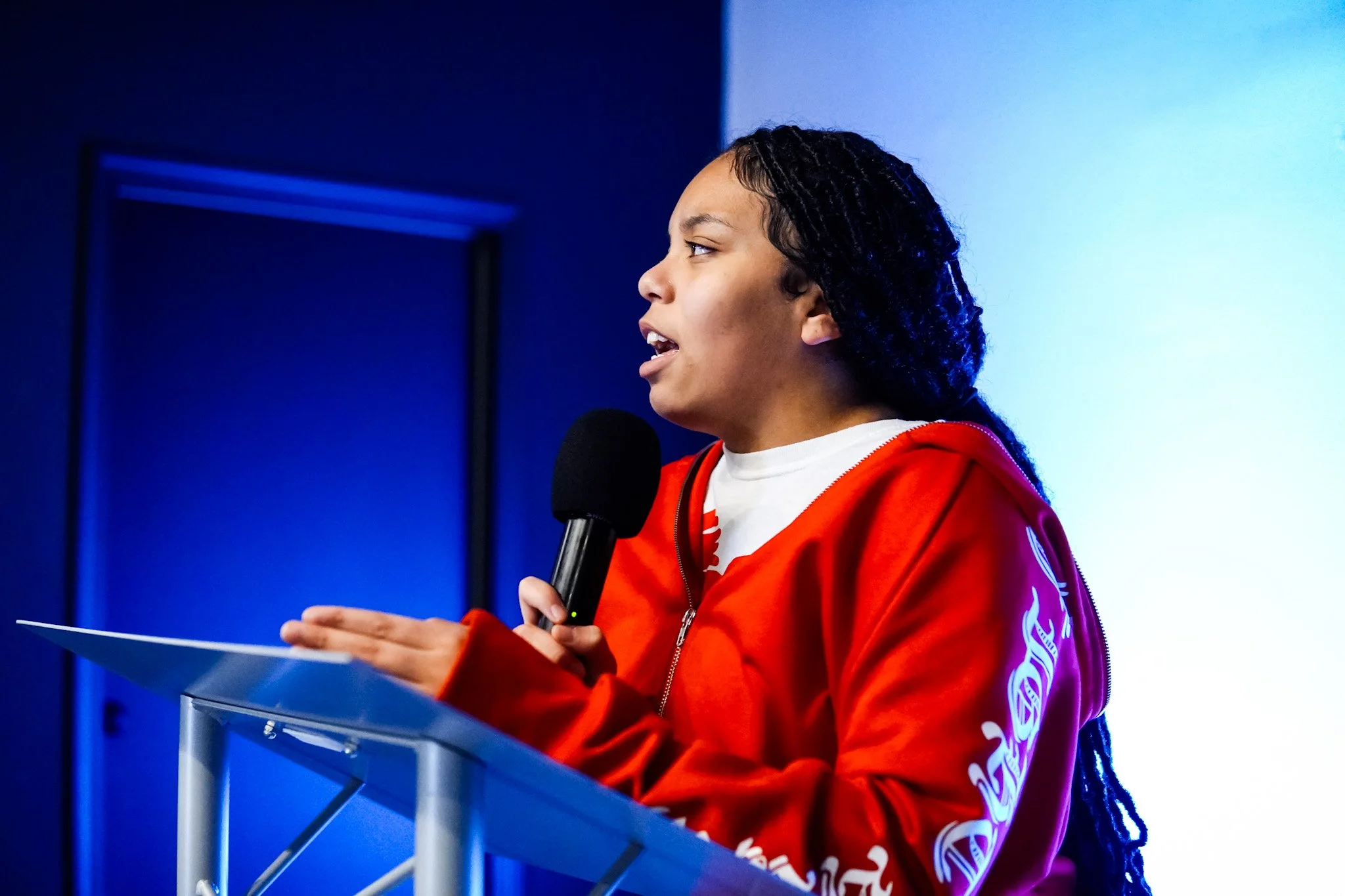 Ashton, a Junior Fellow at Madison Academic High School, exudes confidence on stage while presenting on gun violence.