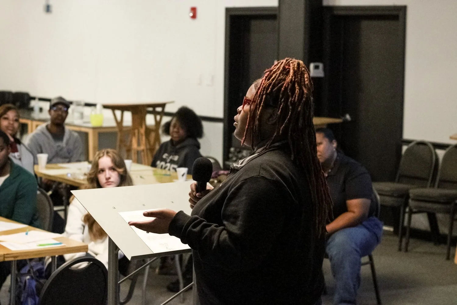 Caris Devore, Jackson Grown Fellow from Liberty Technology High School answers questions during discussion about seeing the big picture in day-to-day challenges we see around us.