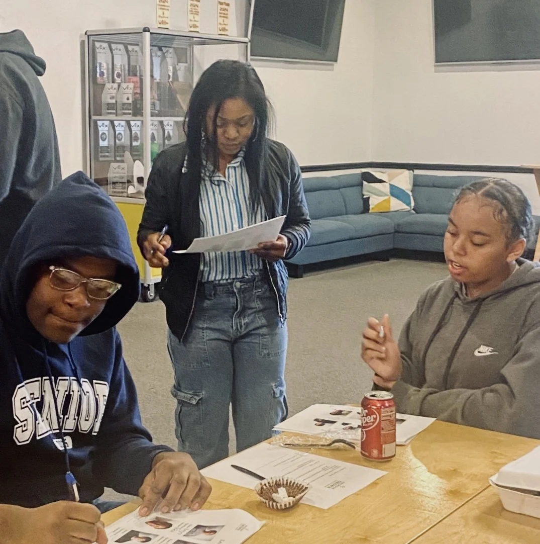 Mentor, Carita Cole, works with fellows, Kemora, South Side Junior, and Jacorey, JCM Senior.
